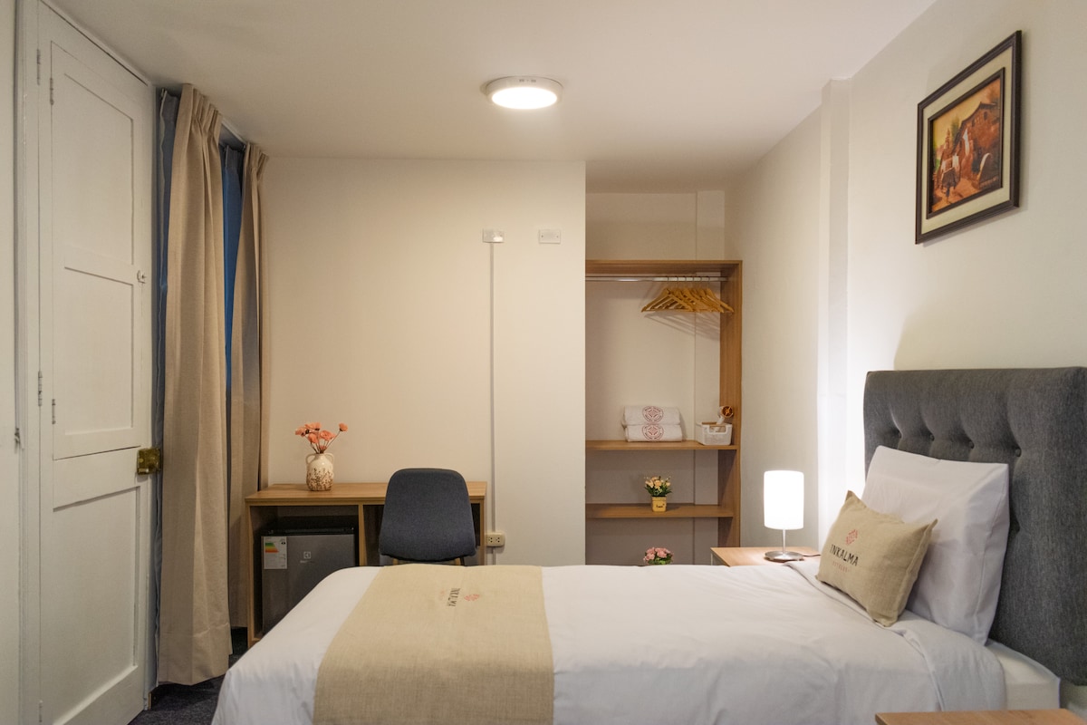 Habitació amb llit gran i bany privat a l'hotel, situada a l'avinguda principal de Cayma. Zona segura i exclusiva, amb vistes al parc i fàcil accés. A prop de centres comercials, restaurants, bancs i les places Cayma i Yanahuara. Ideal per a parelles que busquen privacitat, comoditat i una ubicació excel·lent a Arequipa. Ubicació privilegiada a Cayma: avinguda principal, mobilitat ràpida. Habitacions amb vistes al parc/avinguda. A prop de Mall Plaza i Real Plaza. No gaire lluny del centre històric.