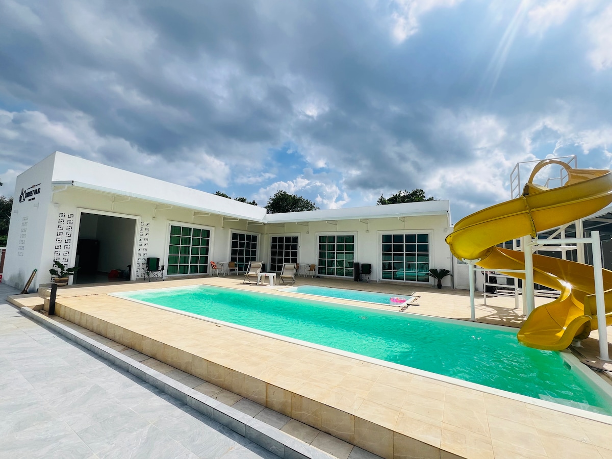 ยกกันมาทั้งครอบครัวเลย ที่พักดีๆ มีที่ให้เล่นสนุกมากมาย กับพูลวิลล่าส่วนตัวสไตล์มินิมอล อยู่ไม่ไกลจากตัวเมือง เดินทางสะดวก ตั้งอยู่ท่ามกลางทุ่งนาและวิวภูเขา บรรยากาศเงียบสงบ พร้อมชมพระอาทิตย์ตกยามเย็น ให้บริการแบบเหมาทั้งหลัง รองรับผู้เข้าพัก 14–20 ท่าน มี 4 ห้องนอน พร้อมห้องน้ำในตัว ห้องนั่งเล่นขนาดใหญ่ Smart TV และคาราโอเกะ สิ่งอำนวยความสะดวกครบครัน สระว่ายน้ำส่วนตัว 2 สระ สไลเดอร์ โต๊ะพูล ปิงปอง ห้องครัวพร้อมอุปกรณ์ และโซนบาร์บีคิว เหมาะสำหรับครอบครัว กลุ่มเพื่อน และการพักผ่อนแบบเป็นส่วนตัว
