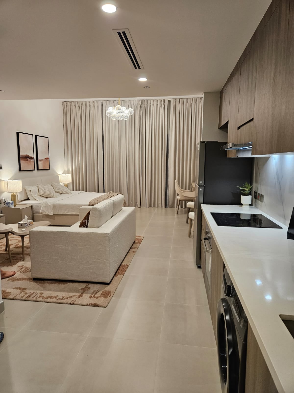 Pis modern d'1 habitació a només 5 minuts de les principals atraccions de l'illa de Yas: Ferrari World, Yas Mall i Yas Waterworld. Gaudeix d'un llit «king size», un sofà llit, 1,5 banys, una cuina completa i wifi ràpida. Relaxa't a la piscina del terrat amb vistes a l'horitzó. Ideal per a parelles, famílies o allotjaments de negocis. Situat en una zona segura amb accés fàcil a cafeteries, supermercats i carreteres principals. Aparcament gratuït i rentadora inclosos. La teva escapada perfecta a Yas t'espera!