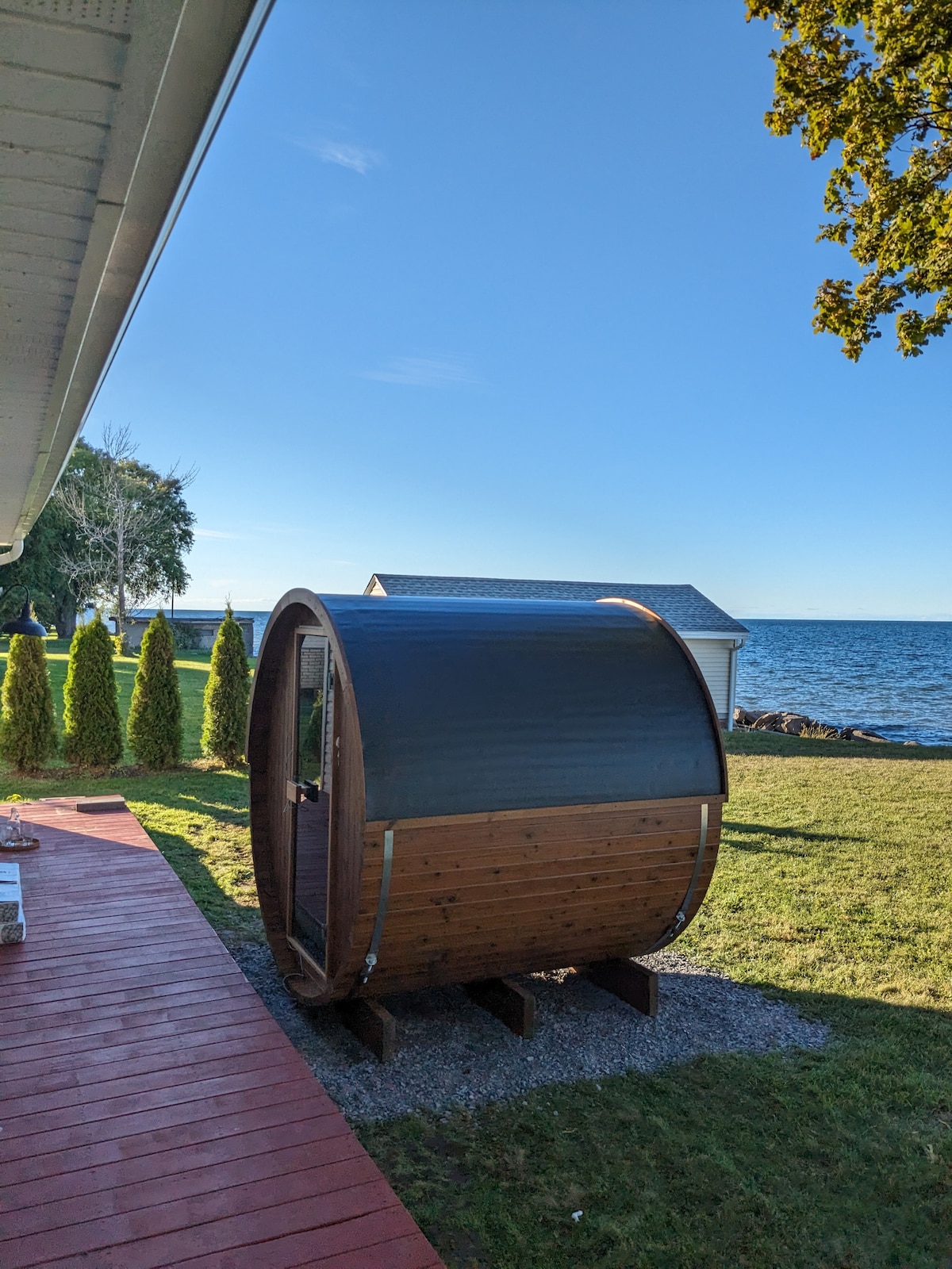 La joia de disseny del llac té Main House, Boat House i Bath House. Boat House és una tarifa addicional i s'ofereix per temporada : consulta els detalls a continuació. Cuina gourmet, llar de foc de roca, coberta expansiva, escales al llac amb moll, plataforma de natació, anell de foc, cadires de platja, 4 caiacs i una canoa per al teu ús. A només una excursió d'un dia a les cascades de Niagra o Toronto i a 5 minuts del riu Oak Orchard, que acull pesca de classe mundial.