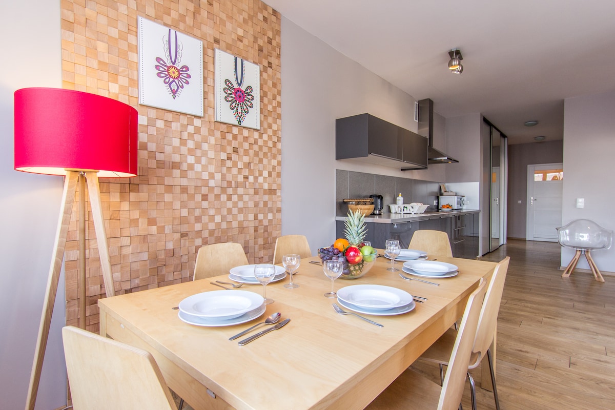 EL PIS DE CAFÈ és un lloc acollidor i decorat amb estil on molts hostes se sentiran com en una cabana de muntanya. Aquesta impressió està evocada per la gran quantitat de fusta que s'utilitza per acabar aquest interior encantador i elegant. Un avantatge addicional de l'allotjament és un balcó lluminós amb vistes a les muntanyes i una sala d'estar càlida equipada amb llar de foc. El pis es troba en una zona tranquil·la de la ciutat, lluny de l'enrenou i el soroll, però a pocs minuts en cotxe del centre.