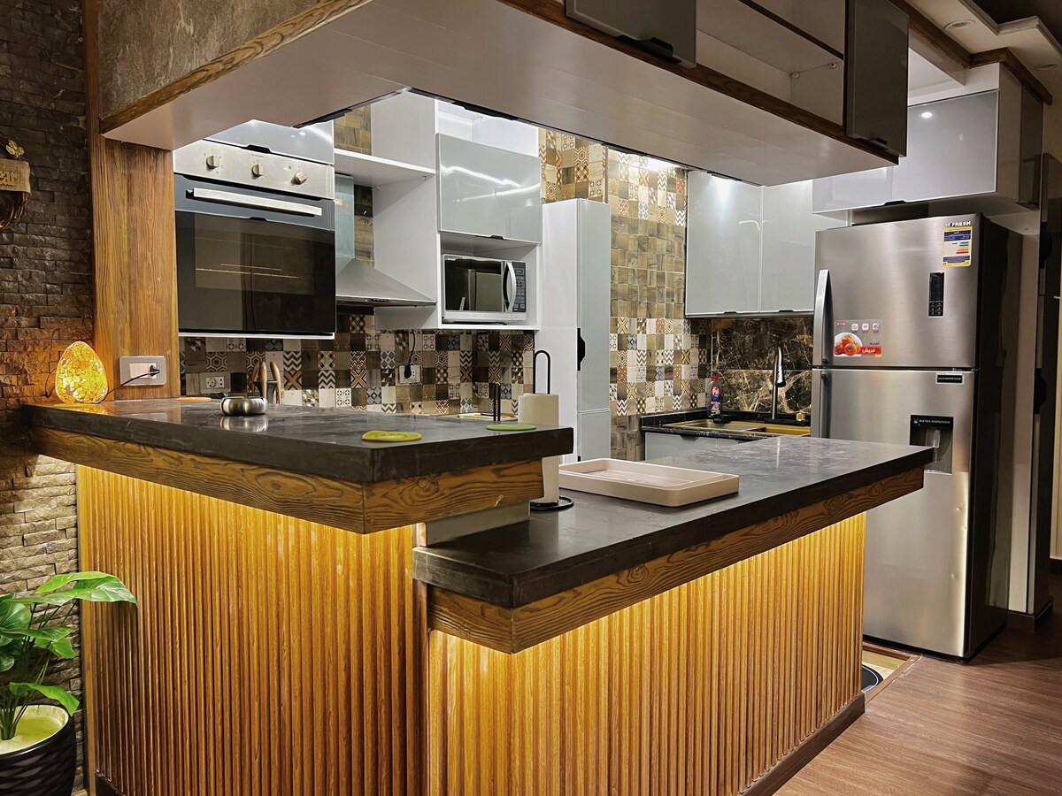 Situat al centre de Zamalek. Accés directe a la carretera principal de Zamalek. La barreja perfecta d'una casa moderna, clàssica i retro • Pis elegant i molt acollidor • Seients i balcó a l'aire lliure • Vidre insonoritzat • Bar interior • Decoració i mobles artístics • Televisor intel·ligent • WIFI RÀPID • Aire condicionat • Cuina totalment equipada • Rentadora • Accés independent • Porter les 24 hores • Atenció a l'hoste les 24 hores • Aparcament gratuït al carrer •Si ho sol·licites: Servei de neteja Visites guiades al Caire Reserva la teva estada a casa lluny de casa!