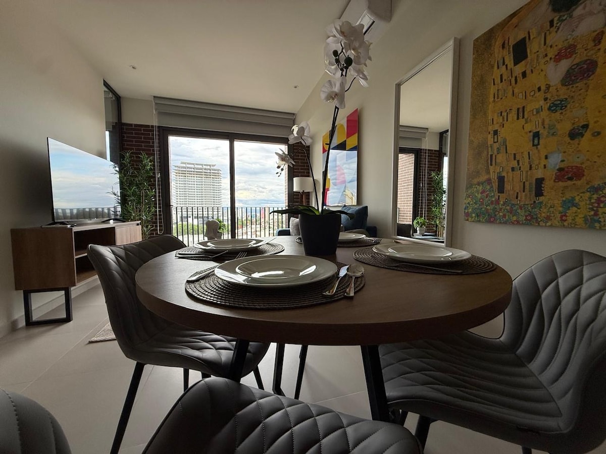 Relaxa't en aquesta escapada única. Gaudeix d'un pis nou amb tots els serveis , gimnàs, terrasses, piscina , jocs infantils, vista panoràmica, zona de treball, farmàcia davantera les 24 hores, a prop de concerts, esdeveniments esportius, hospitals i centres comercials. Seguretat les 24 hores, habitació d'hostes amb llit «king size», bany, vestidor molt espaiós,sala d'estar amb un sofà llit amb dos llits individuals on pot dormir un adult o dos nens, una cadira infantil i un bressol de viatge disponibles si és necessari.
