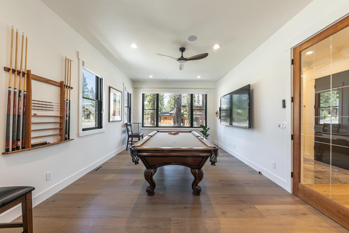 Perfect Polaris is a marvelous alpine villa in North Lake Tahoe, just minutes from Tahoe City and Skylandia Beach, and about a fifteen-minute drive from Homewood and Squaw Valley. The villa features ample outdoor living areas including an open-air hot tub, while its beautiful interiors are well-equipped for dining, relaxation, and play. Five comfortable bedrooms, including kid-friendly accommodations, form an ideal haven for families. Built of fine timber and nestled amid serene pine forests, this classic Tahoe home immerses you in the rich natural beauty of California's Sierra Nevada. Wrap-around decks extend from both floors of the house, connected by a spiral staircase. Cook barbeque meals on the upper deck and relish them alfresco at the table for six. Soothe your body in the hot tub on the lower deck after an exciting day on the slopes or trails. The outdoor dining area extends from the interior great room, forming an expansive space for evening festivities in every season. Light a fire in the impressive hearth and sip warm beverages in the lounge. Prepare meals in the fully equipped kitchen, serving apps and cocktails at the bar, and gather around the dining table for a well-earned feast. Gather in the cavernous game room before bed, cozying up with your favorite movies or shooting some games of pool. Perfect Polaris gives you exquisite privacy within minutes of Tahoe's famed dining, beaches, and ski slopes. Myriad destinations are within five to fifteen minutes of your door, including Tahoe City, Crystal Bay, multiple ski resorts, and several outstanding beaches, including Commons, Skylandia, and Speedboat. Golfers can take their pick of several renowned courses, including Old Brockway, Northstar, and the Championship Golf Course. Copyright © Luxury Retreats. All rights reserved. BEDROOM & BATHROOM • Bedroom 1 - Primary: King size bed, Ensuite bathroom with heated floors and stand-alone rain & steam shower, Dual Vanity, Walk-in closet, Fireplace, Television, Access to shared terrace • Bedroom 2: King size bed, Ensuite bathroom with stand-alone shower, Dual Vanity, Walk-in closet, Television, Access to shared terrace • Bedroom 3: King size bed, Ensuite bathroom with stand-alone shower, Dual Vanity, Television, Access to shared terrace • Bedroom 4: Bunk bed (twin over full), Ensuite bathroom with hall access, Shower/jetted tub combo • Bedroom 5 : 2 Twin beds, Shared access to hall bathroom with bedroom 4 Additional Bedding • Game Room: Sofa bed