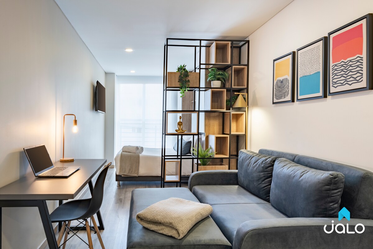 Un estudi elegant i petit en una de les seccions més cèntriques, segures i de moda de Chapinero, el millor barri de Bogotà per als amants de la gastronomia i el cor de la comunitat creativa i fresca. Gaudeix d'una sala d'estar oberta amb finestrals enormes, projector amb Netflix, internet de fibra òptica i una decoració elegant. El barri és LGBTQ+ friendly 🏳️🌈