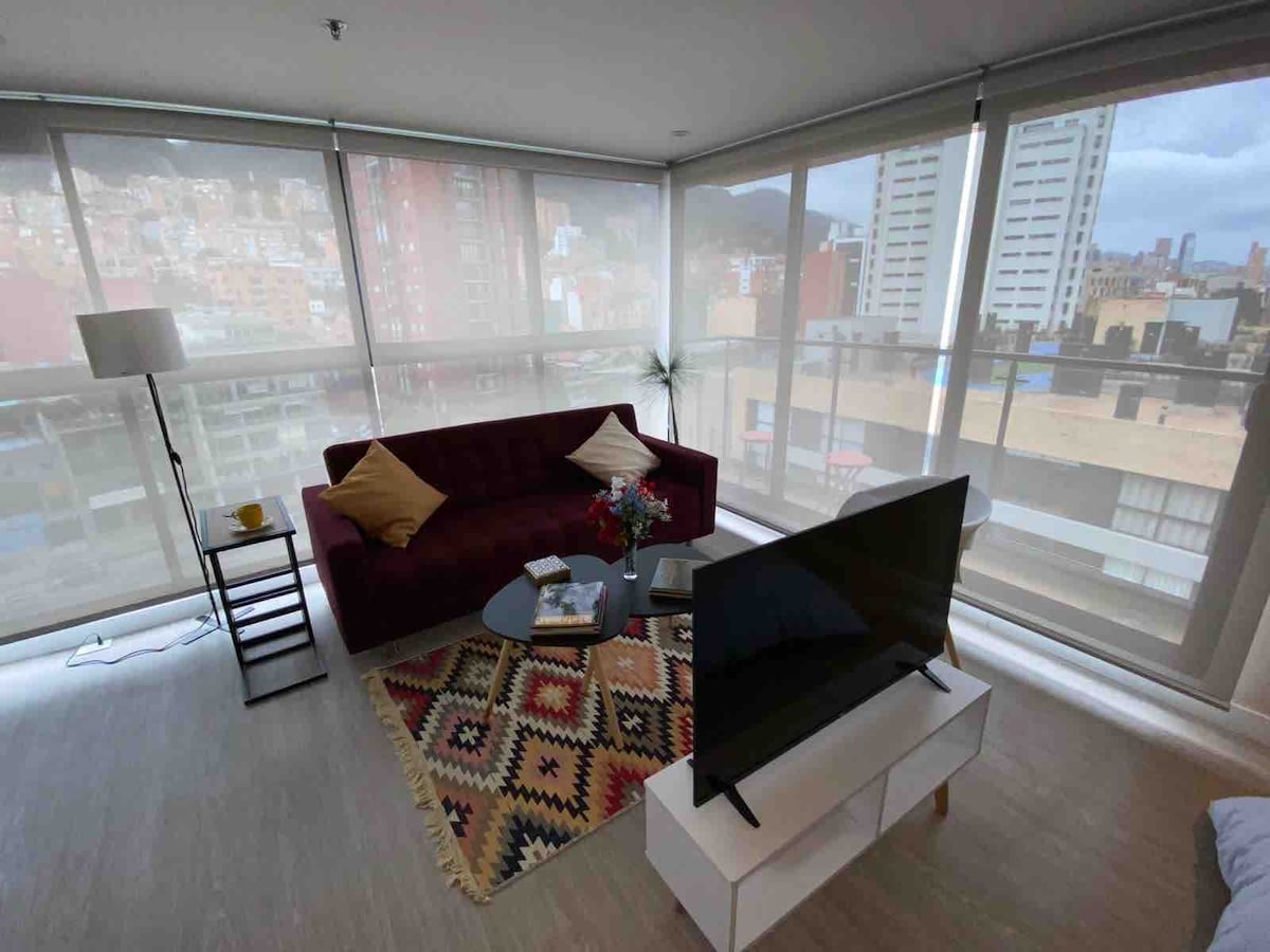 Apartaestudio amb terrassa nova moblada i equipada, placa intel·ligent per a més seguretat, vigilància les 24 hores, televisió amb plataformes i canals de streaming, Wifi; Situat a Chapinero, zona estratègica de la ciutat de Bogotá, on trobaràs centres comercials propers, els millors restaurants i bars de la ciutat Recomanació: en el moment de fer la reserva, es demanarà una foto del document d'identitat per fer l'autorització per entrar a l'edifici, tal com exigeix l'administració.